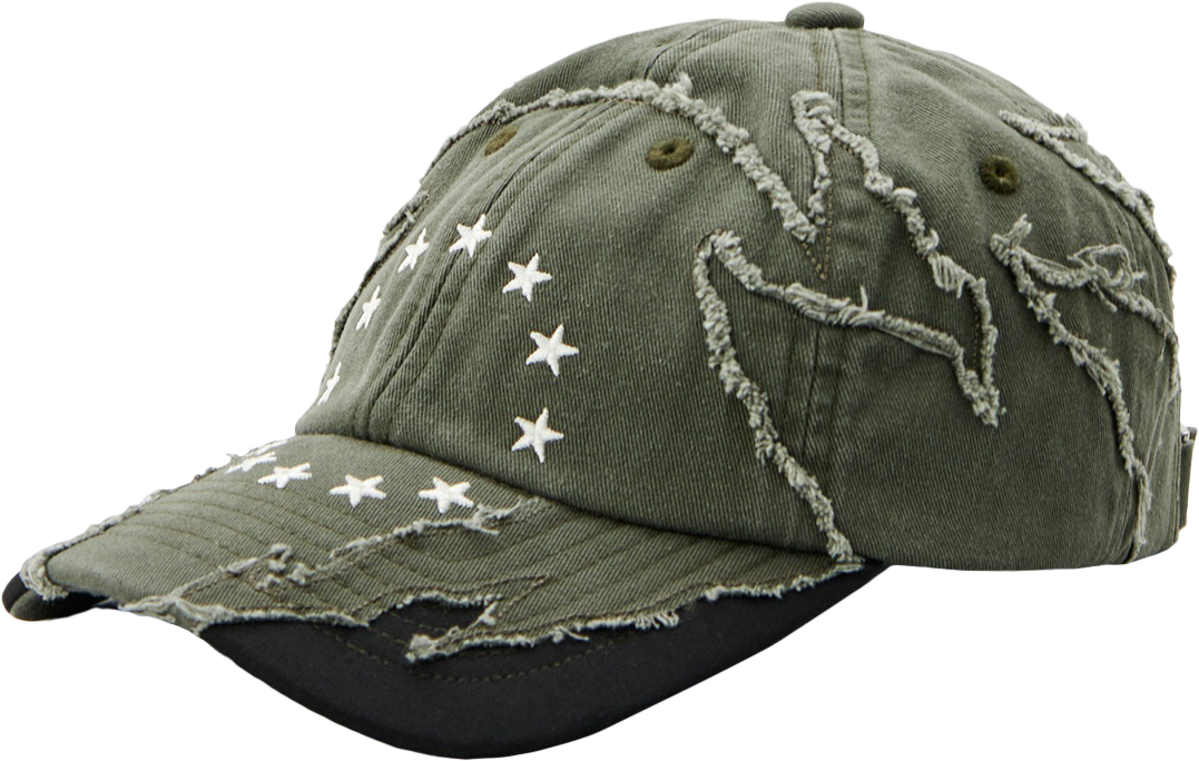 Головной убор в трендовом оттенке хаки точно не будет лишним, особенно пока не пришло время шапок. Наружные швы и «рваный» эффект добавляют дополнительные баллы к стилю.