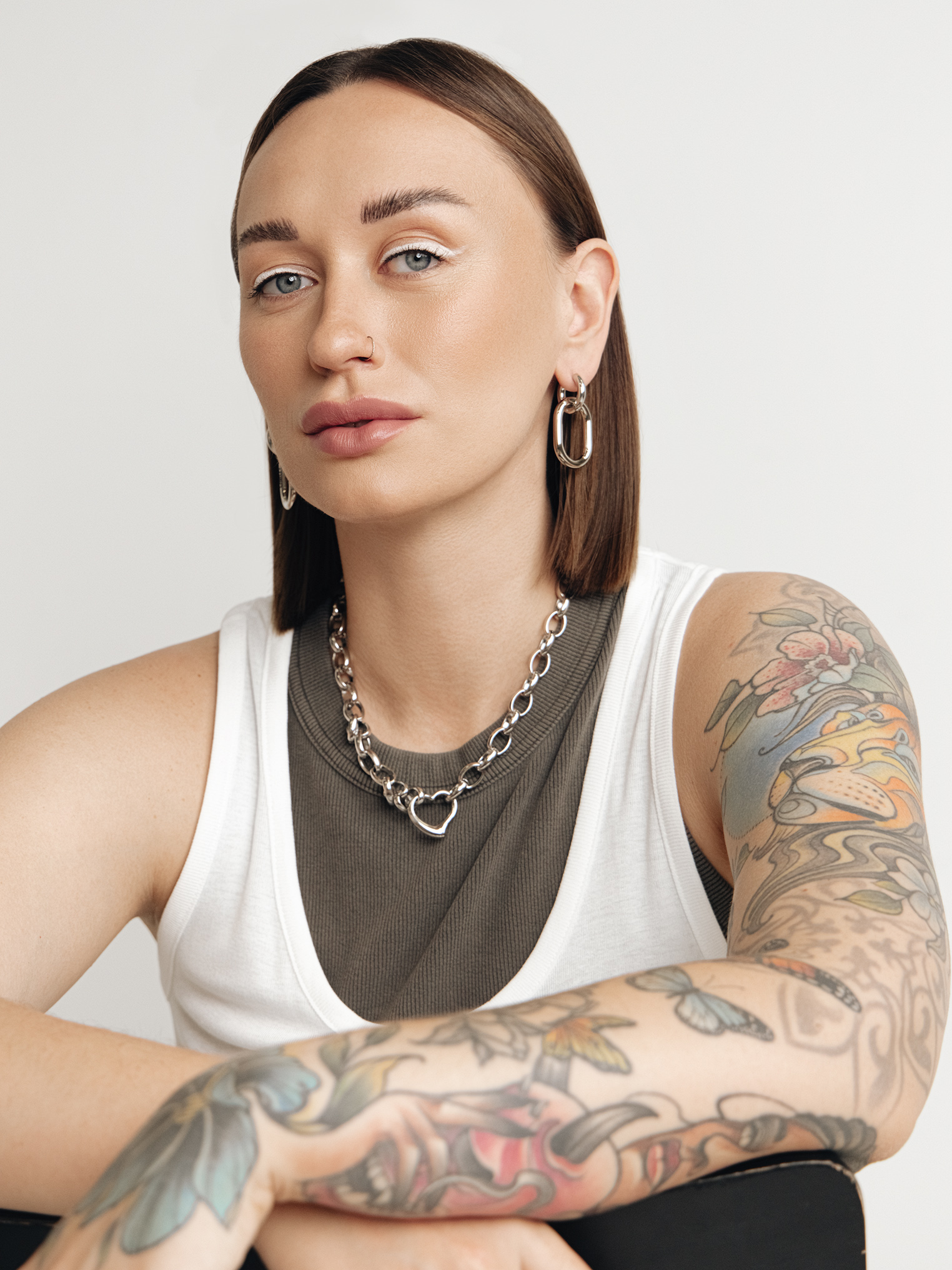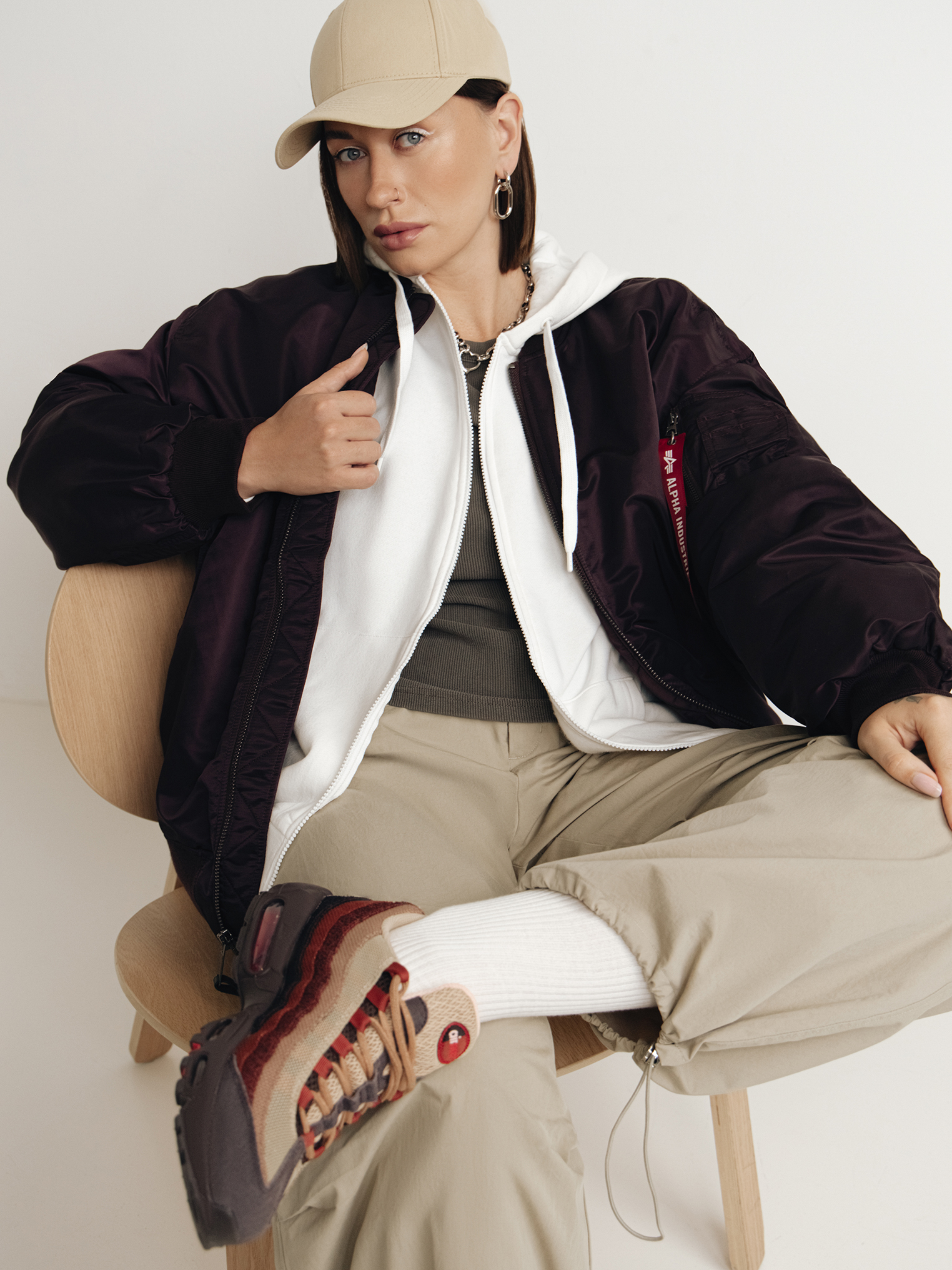 Майка и брюки Lime, майка Mango, куртка Alpha Industries, толстовка O'stin, кроссовкиNike, бейсболка Urban Tiger, носки UNIQLO, серьги Omut и цепь ChromeMans