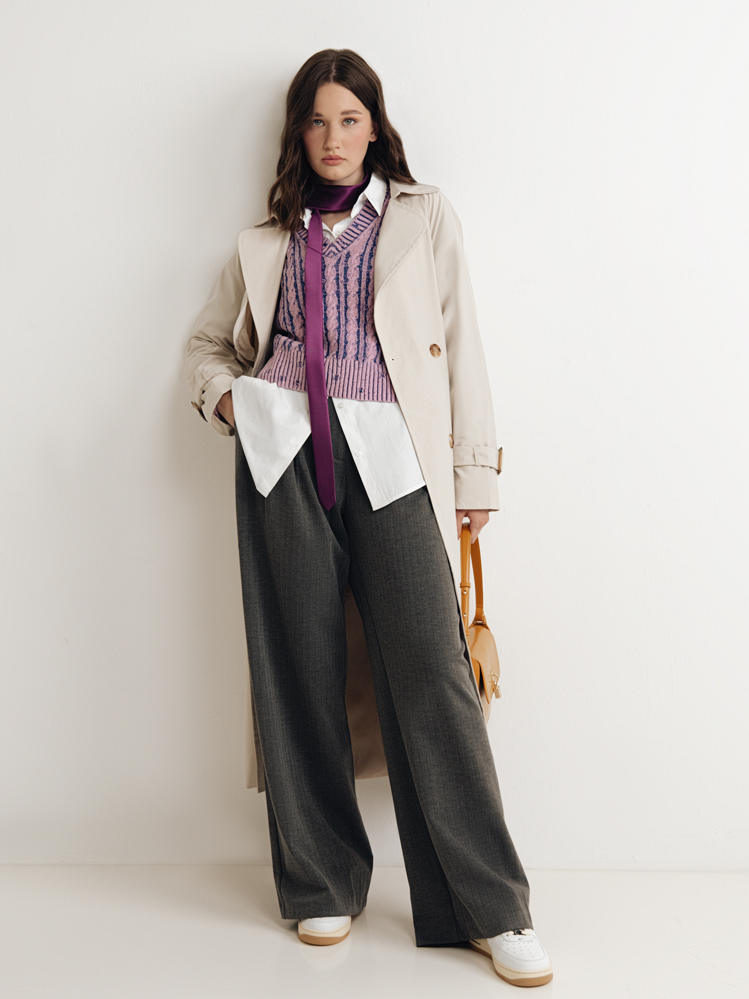 Плащ Nataly Rik, пуловер Diesel, рубашка Gloria Jeans, брюки Zarina, кедыNike, сумка Ekonika, носки UNIQLO и галстук Pierre Lauren