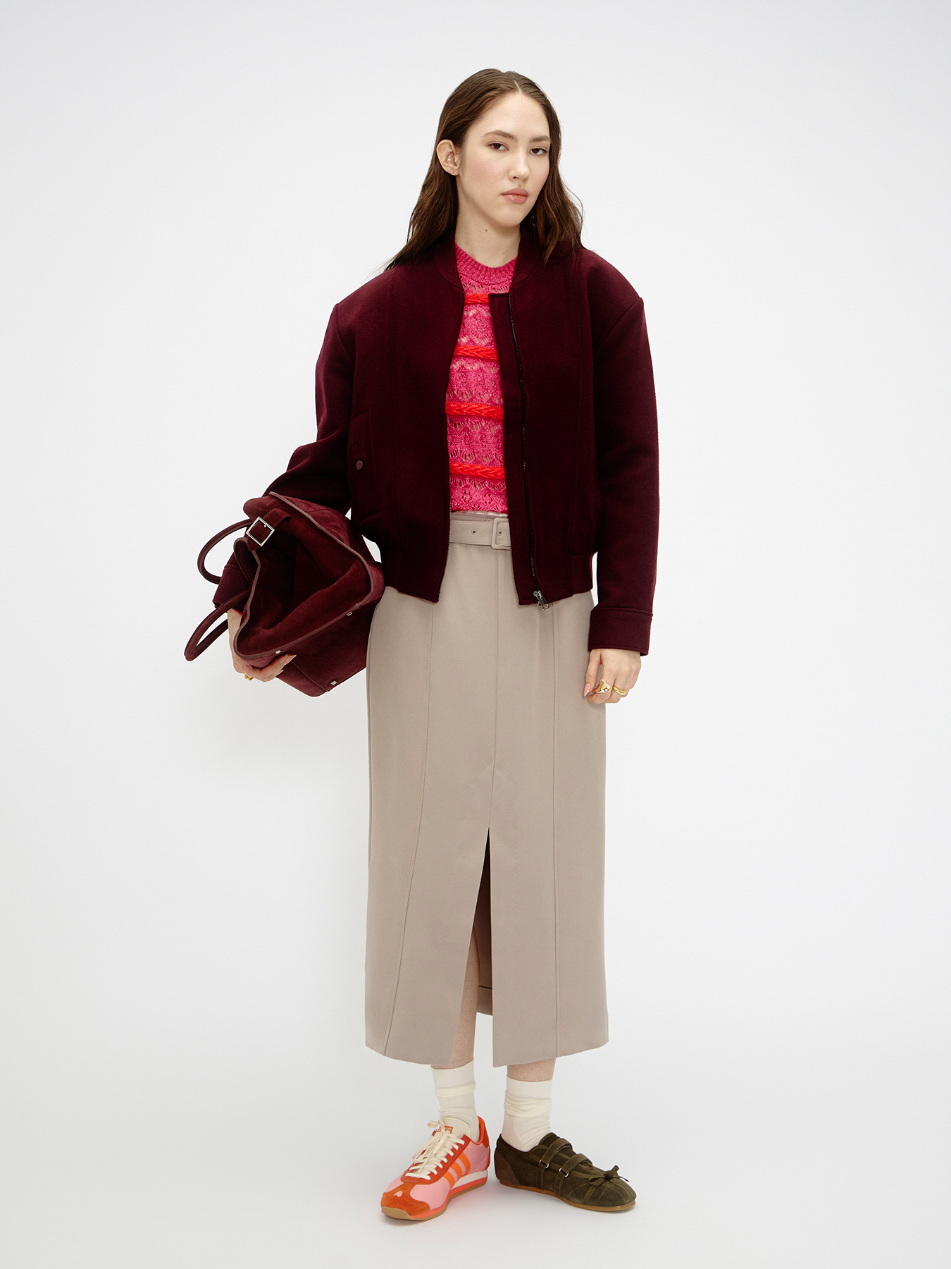 Джемпер и бомбер Mango, юбка и носки Sela, сумка Saffa de Rosa, кольцо и кольца Love Republic, кроссовки Adidas Originals, туфли Grand Style