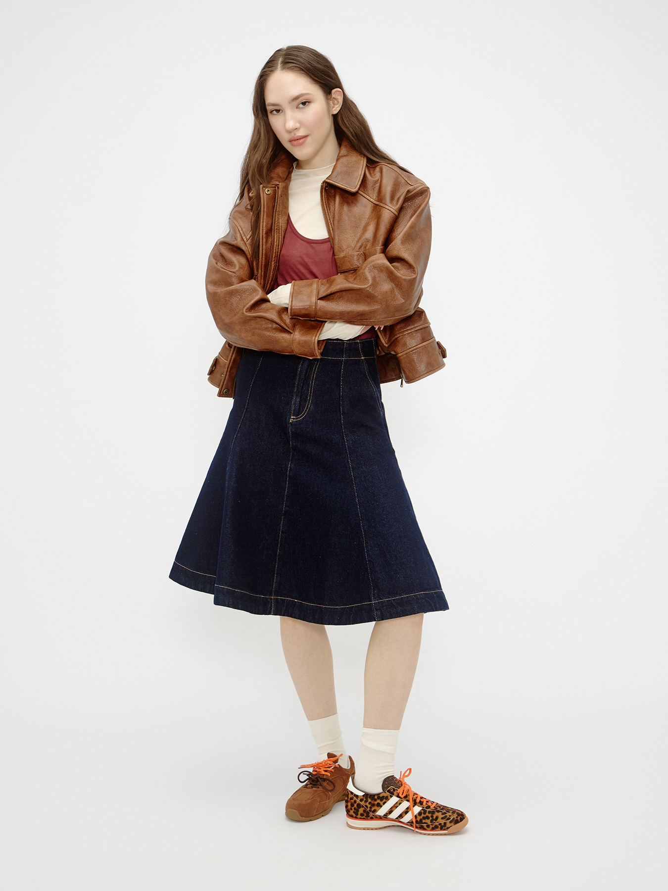Куртка Love Republic, лонгслив и юбка Mango, майка Lime, носки Sela, кроссовки Obba, кроссовки Adidas Originals