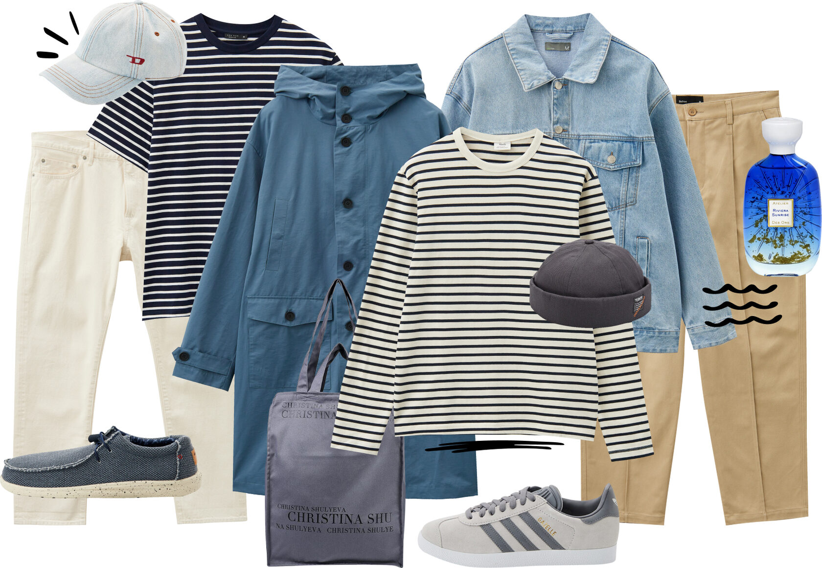 Лонгслив Mango Man, плащ Finn Flare, куртка Sela, футболка Zrn Man, шапка Termit, брюки Befree, джинсы UNIQLO, сумка Christina Shulyeva, кеды adidas Originals, бейсболка Diesel, топсайдеры Aeronautica Militare, парфюмерная вода Atelier Des Ors