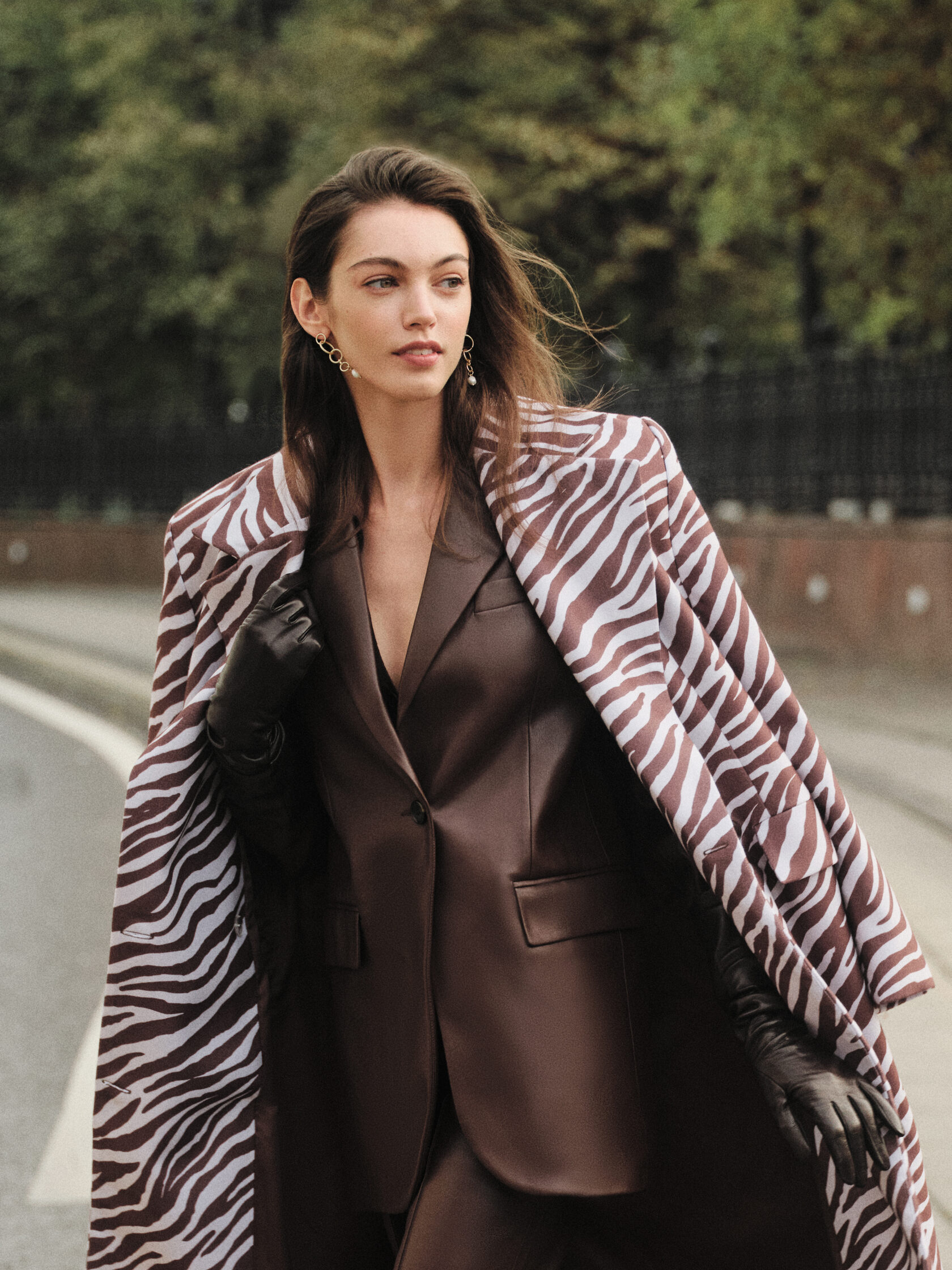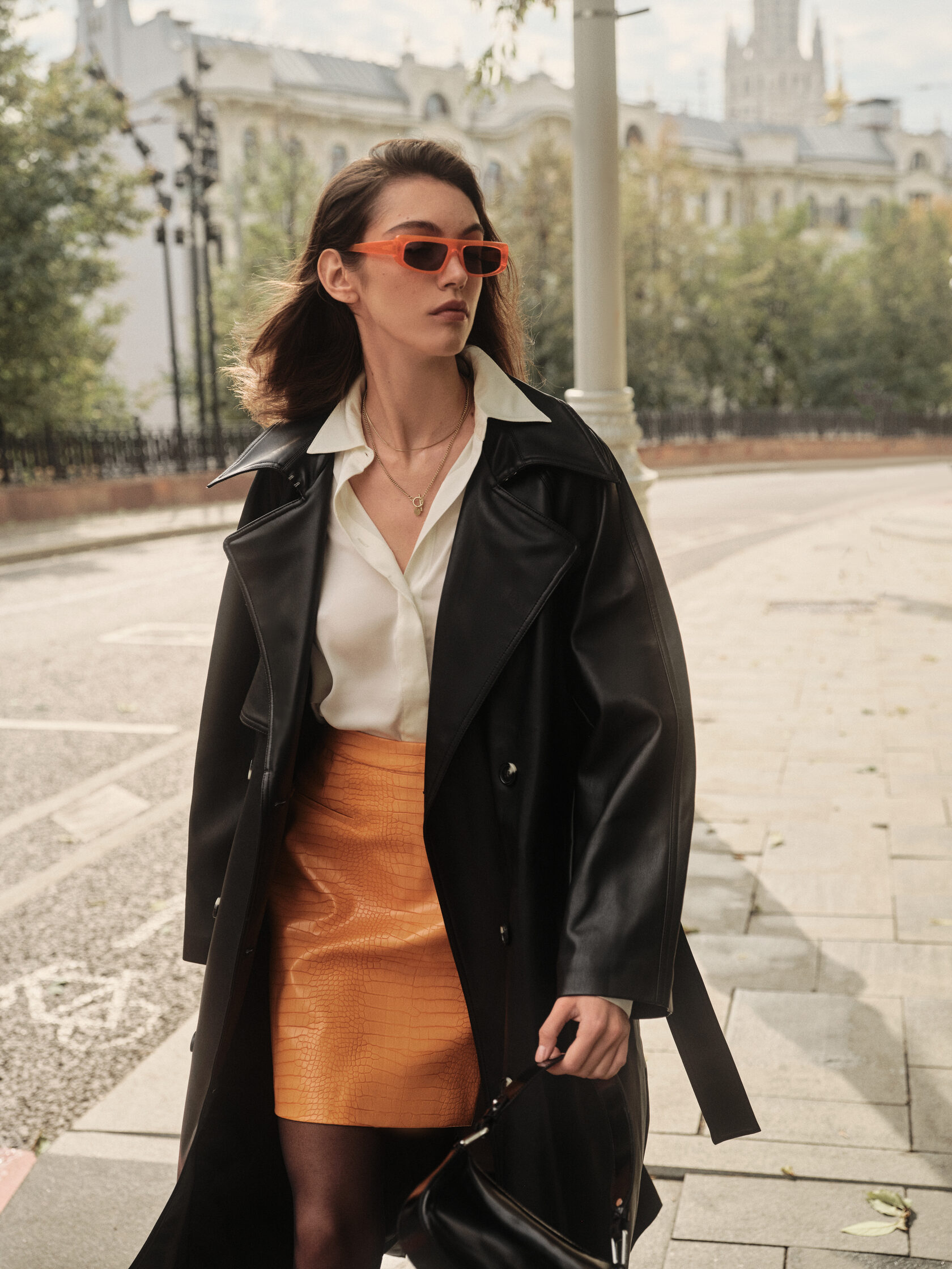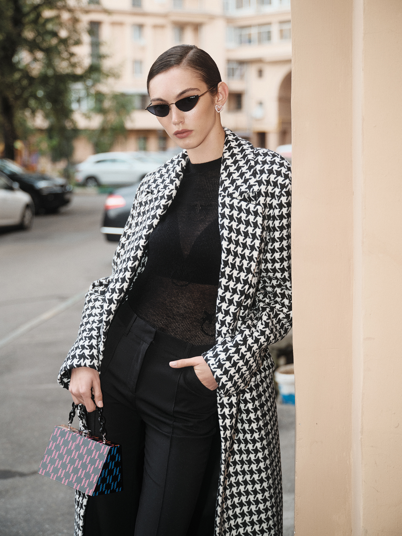 Пальто Top Top, джемпер Pinko, бюстгальтер Incanto, брюки Barbara Bui, серьги Swarovski®, клатч Karl Lagerfeld, солнцезащитные очки Vogue® Eyewear