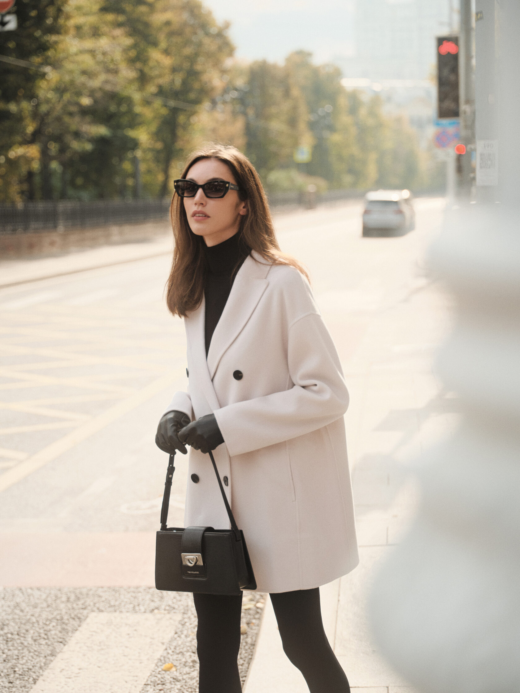 Полупальто 12storeez, водолазка Concept Club, леггинсы Belle You, клипсы Swarovski®, сумка Trussardi, солнцезащитные очки Furla, перчатки Fabretti