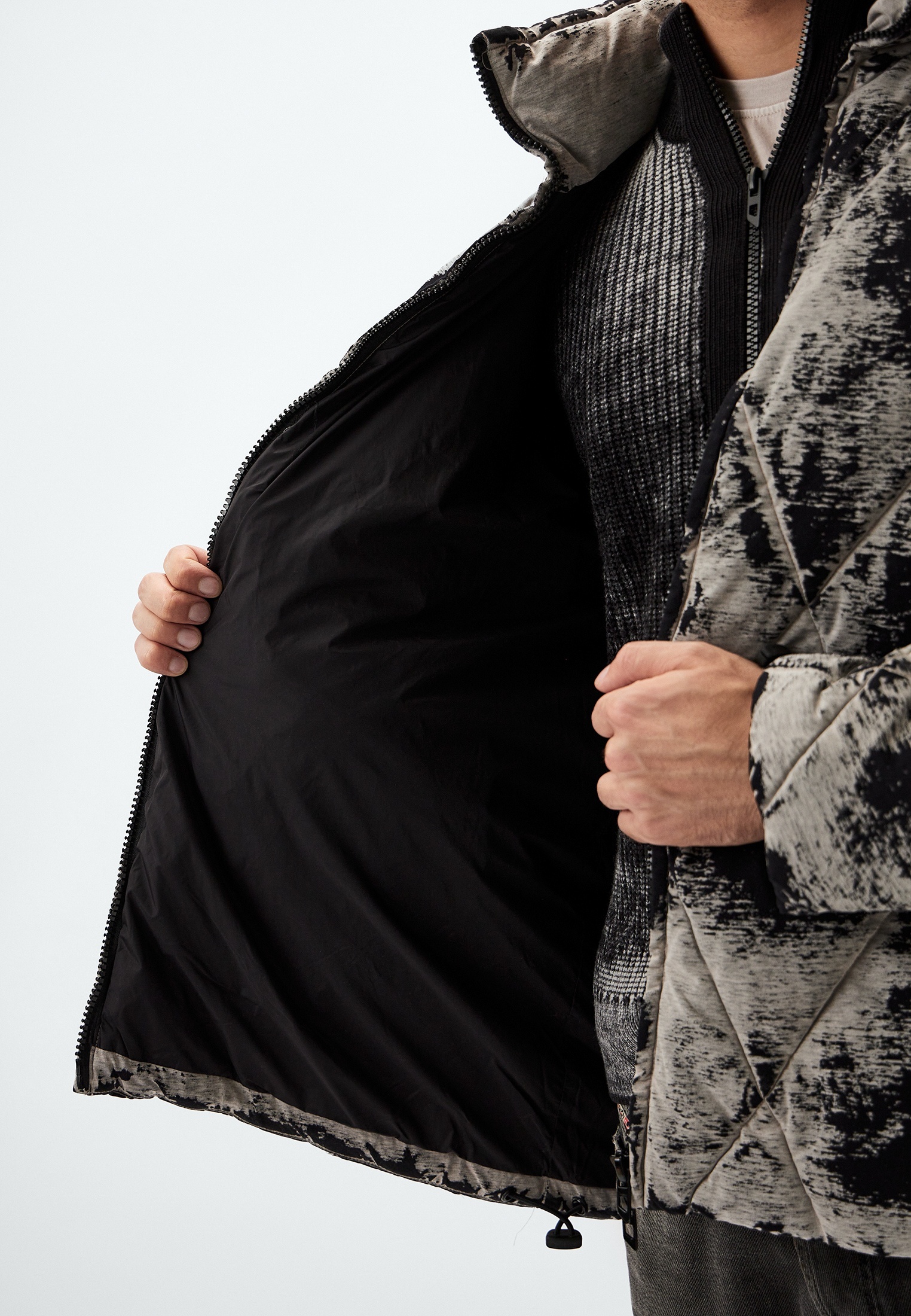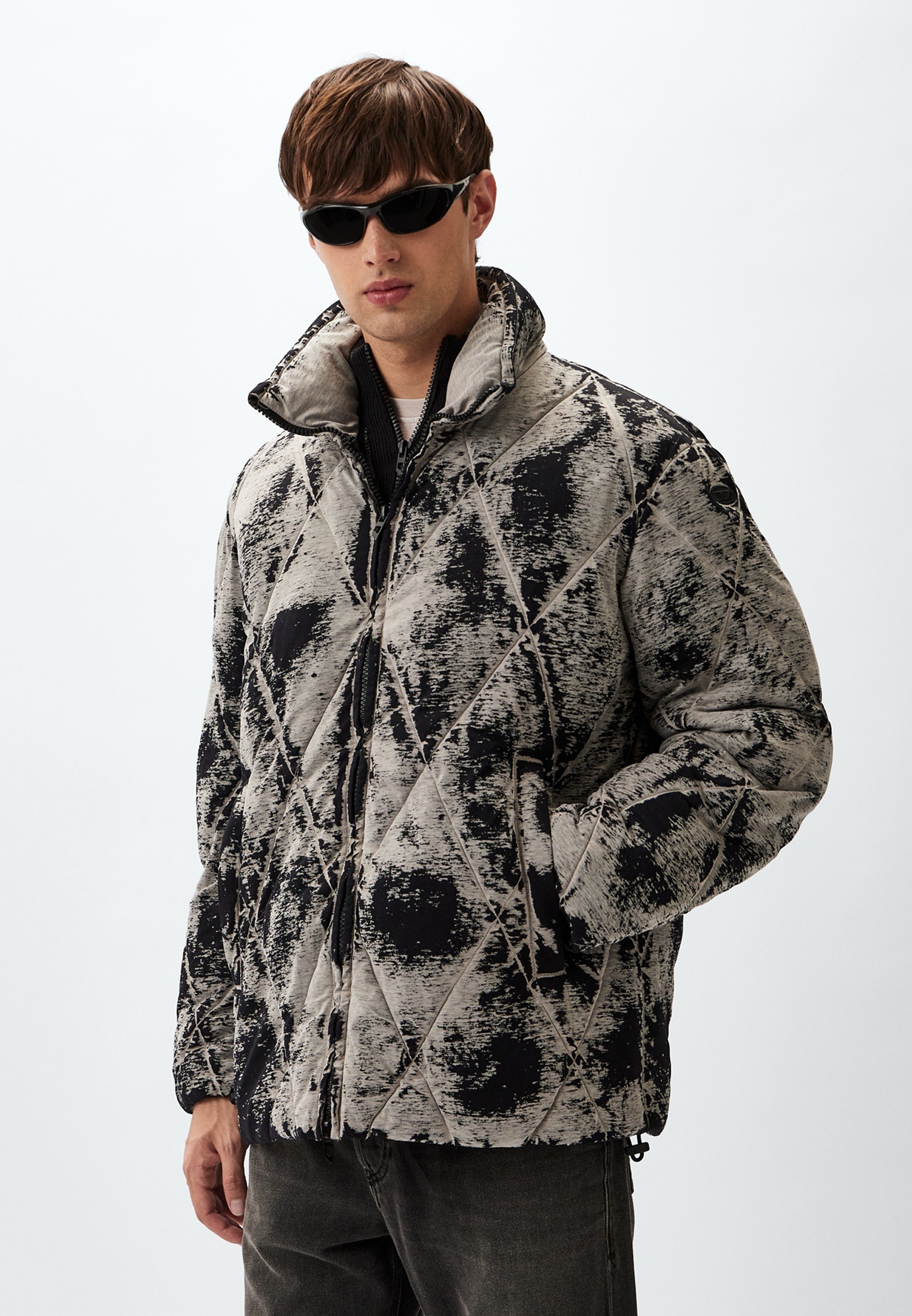 Одна из самых интересных курток на зиму, которую я видел в последнее время. «Загрязненный» принт обыгрывает прямой силуэт, добавляет объема и динамики. Хочется как можно дольше рассматривать, чтобы в итоге понять, где необычный рисунок, а где — возможные следы настоящих капель слякоти.