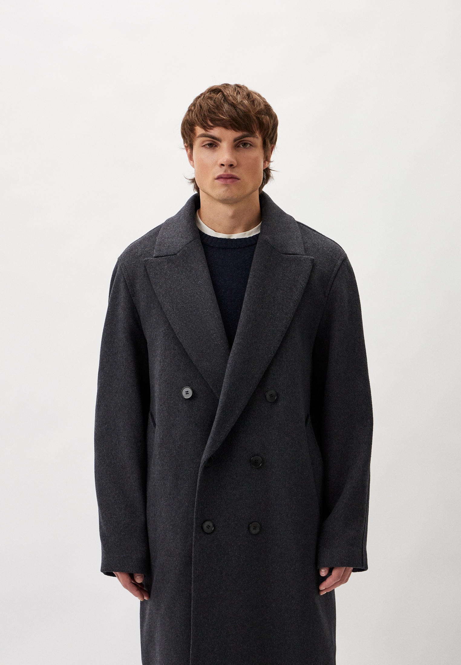 Универсальный серый цвет, оверсайз-крой и длина ниже колена — формула идеального пальто. У этой модели есть еще пара бонусов: шелковая подкладка (это всегда приятно) и съемный пояс в комплекте.