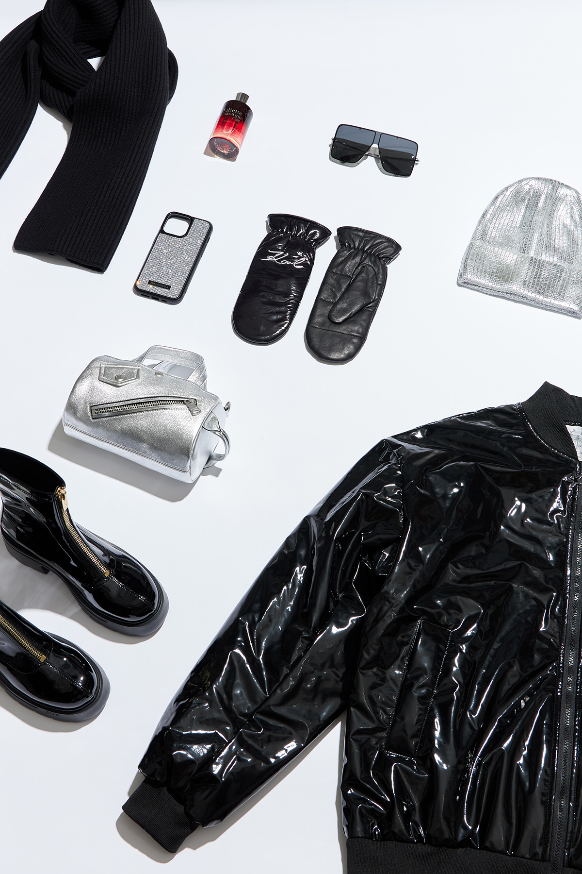 Варежки, сумка и чехол для iPhone Karl Lagerfeld, куртка Libellulas, очки солнцезащитные Max Mara, ботильоны Liu Jo, шапка Tegin's Angel