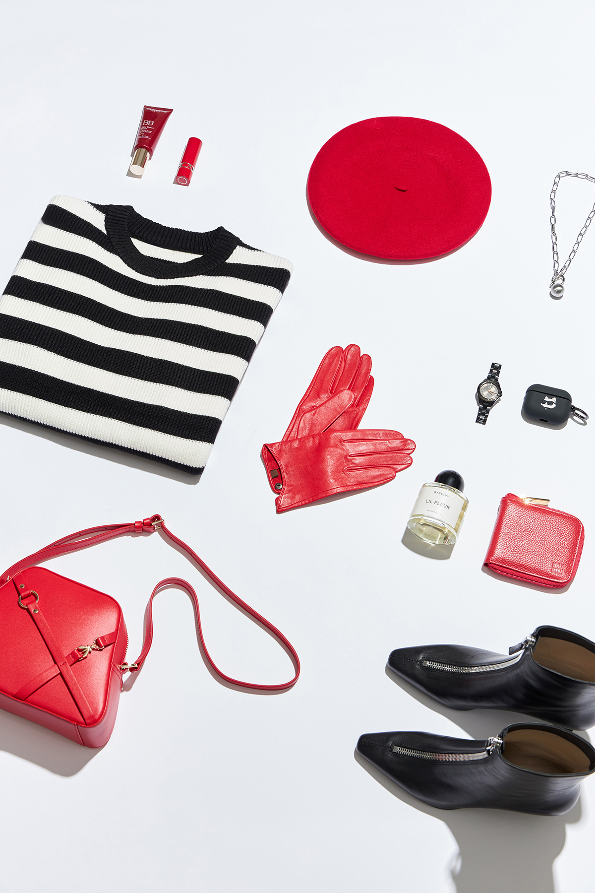 Берет United Colors of Benetton, перчатки Pitas, BB-Флюид Clarins, джемпер Sela, часы Wainer, ботильоны Ekonika Premium, цепь Lilaccat, чехол для наушников Karl Lagerfeld, футляр для помады Clarins, кошелек Mumi, сумка Patrizia Pepe