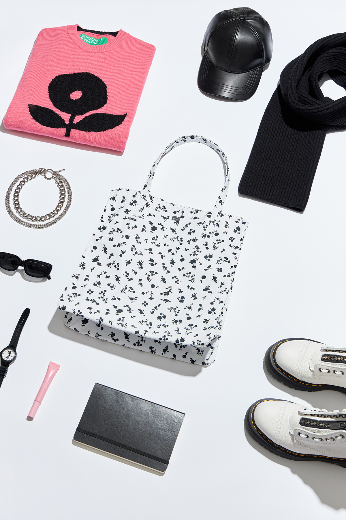 Сумка и джемпер United Colors of Benetton, цепь Omut, ботинки Dr. Martens, часы DKNY, блокнот Deli, шарф Ice Play, солнцезащитные очки Vogue® Eyewear