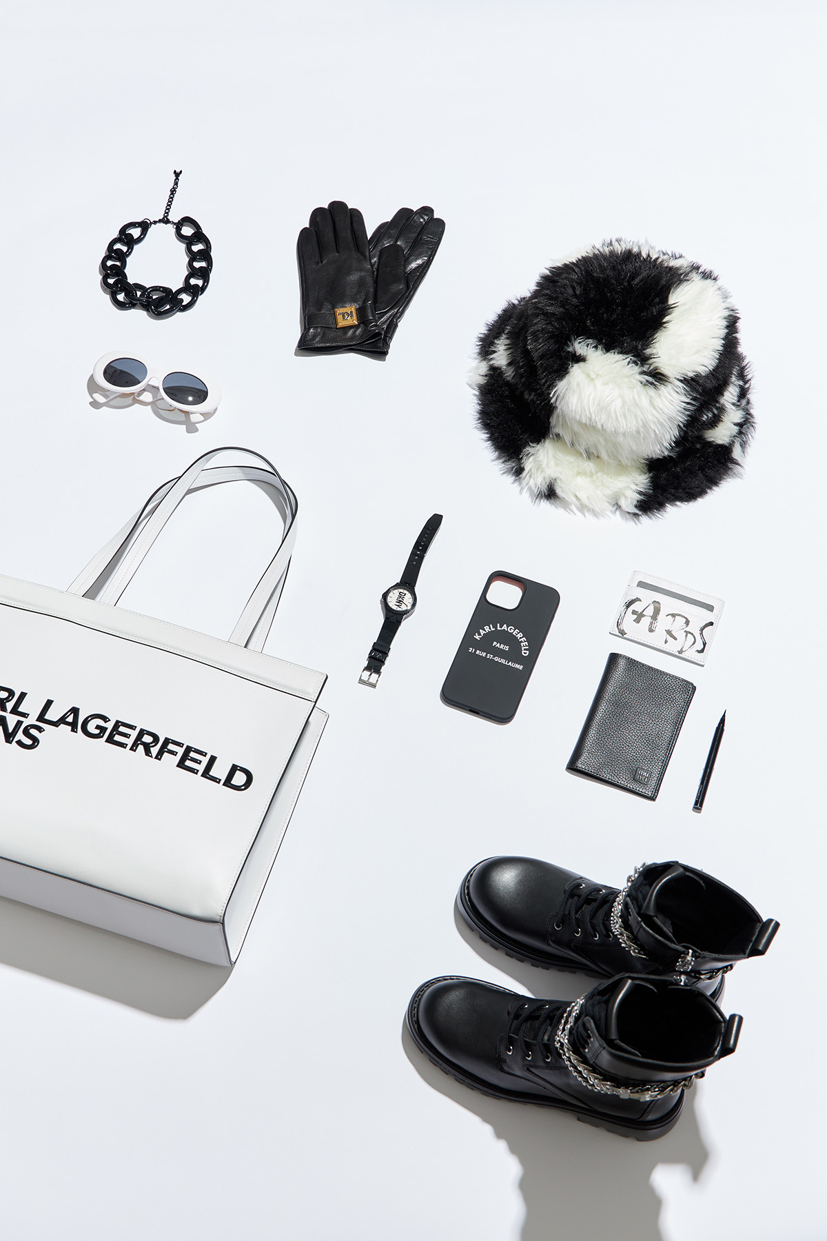 Солнцезащитные очки Versace, цепь Patrizia Pepe, подводка для глаз MAC, обложка для паспорта и кредитница Mumi, часы DKNY, чехол для iPhone, панама, перчатки и ботинки Karl Lagerfeld, сумка Karl Lagerfeld Jeans