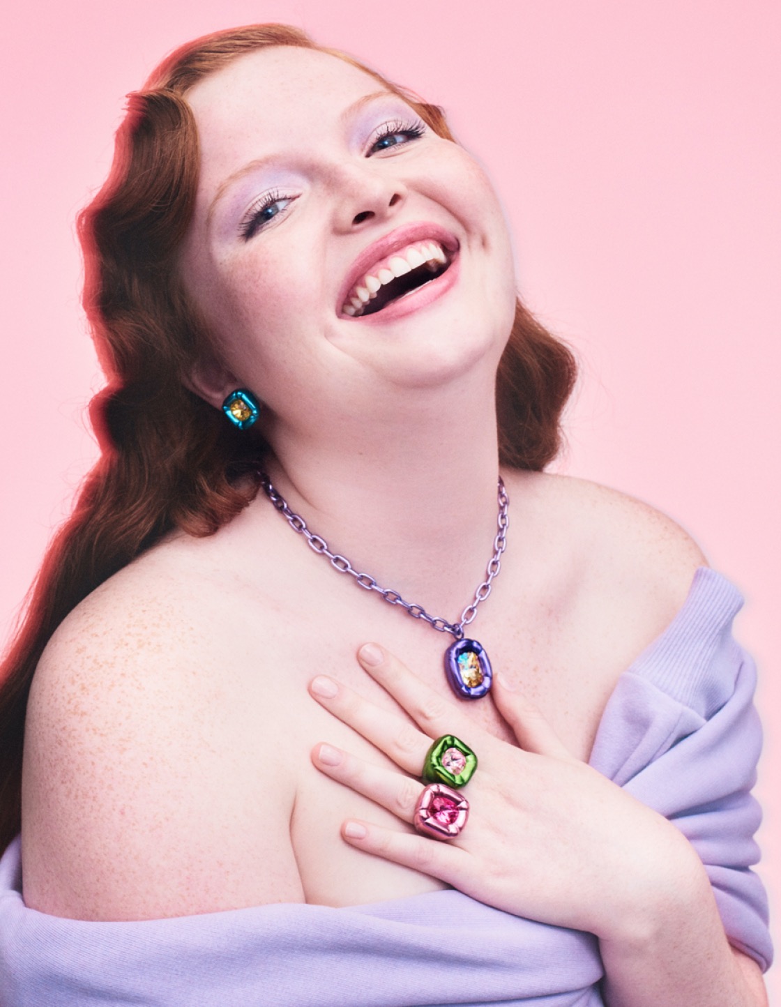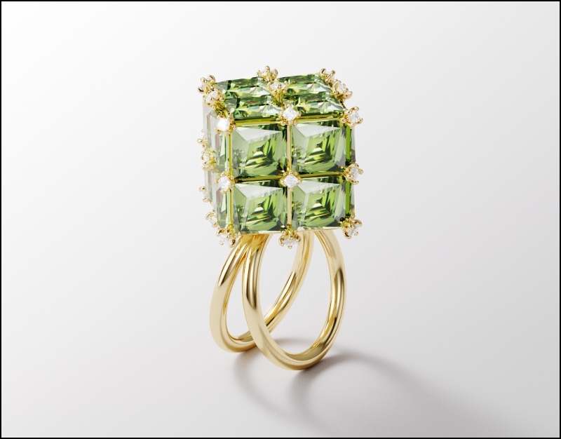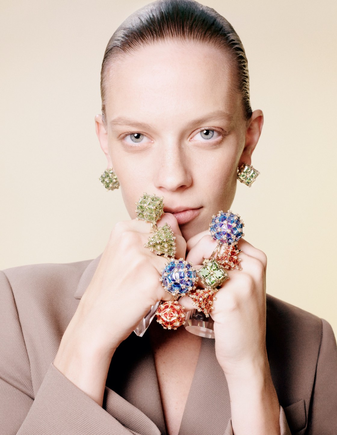 В новую коллекцию вошли серьги, кольца, браслеты и украшения для тела, представленные в смелых сочетаниях цветов. Магия проявляется здесь в особенной огранке «кушон», напоминающей бриллиант, а еще в смелых формах и размерах, но в то же время универсальном прочтении, что по-прежнему заставляет думать о марке как об изделиях на каждый день.