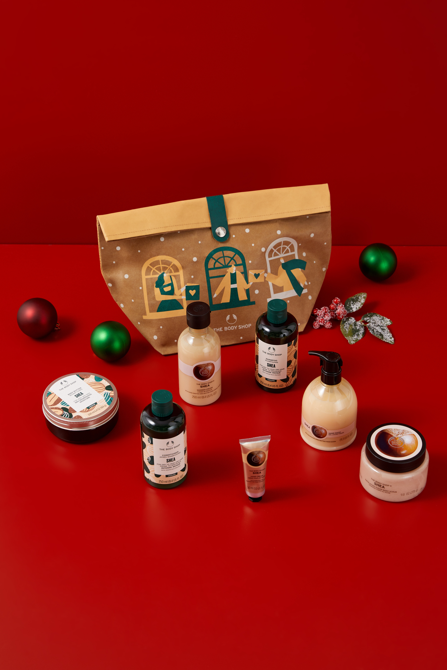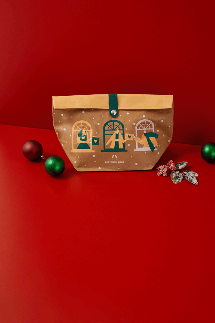 В крафтовой экоупаковке — полноразмерные средства для тела и волос. Главный ингредиент — натуральное масло ши из Ганы, оно отлично впишется в зимний уход за сухой кожей и волосами. А уютный ореховый аромат будет сопровождать весь день.