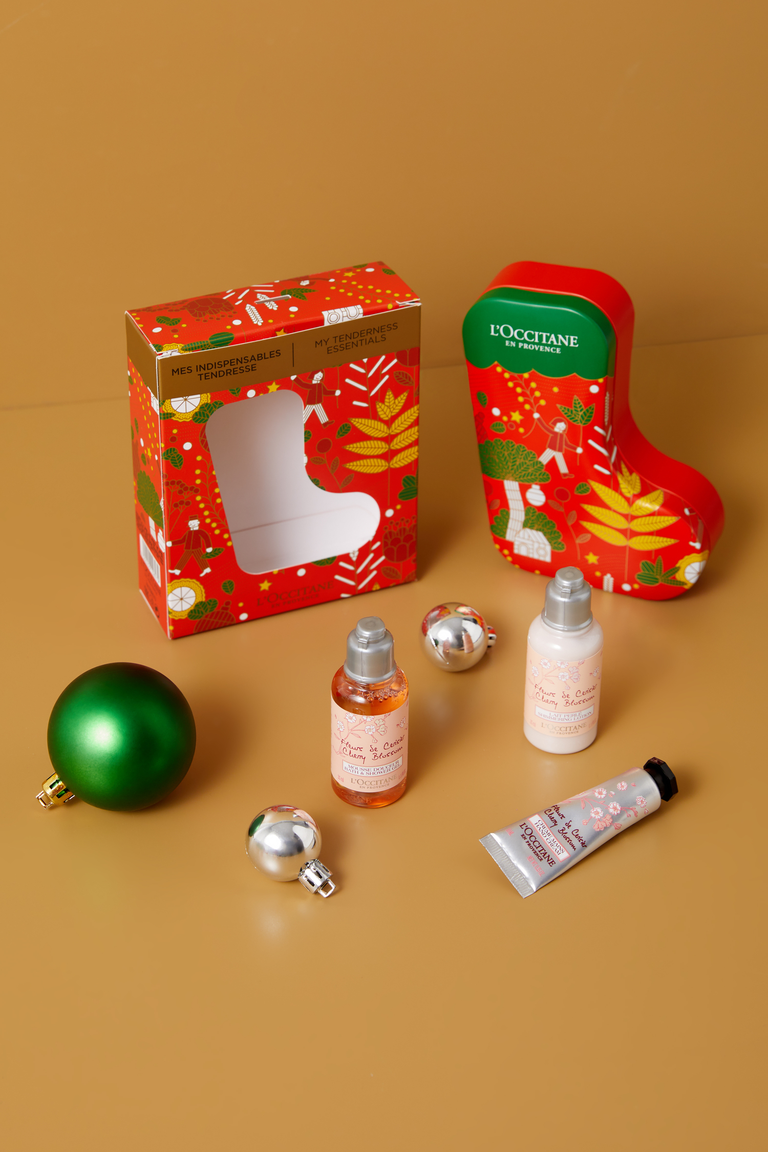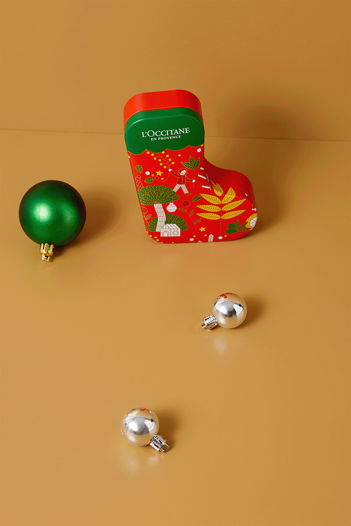 Очень милый рождественский носок можно не просто положить под елку, а повесить на нее в качестве украшения. Внутри — миниатюры бестселлеров для тела с ярким ароматом вишневых цветов.