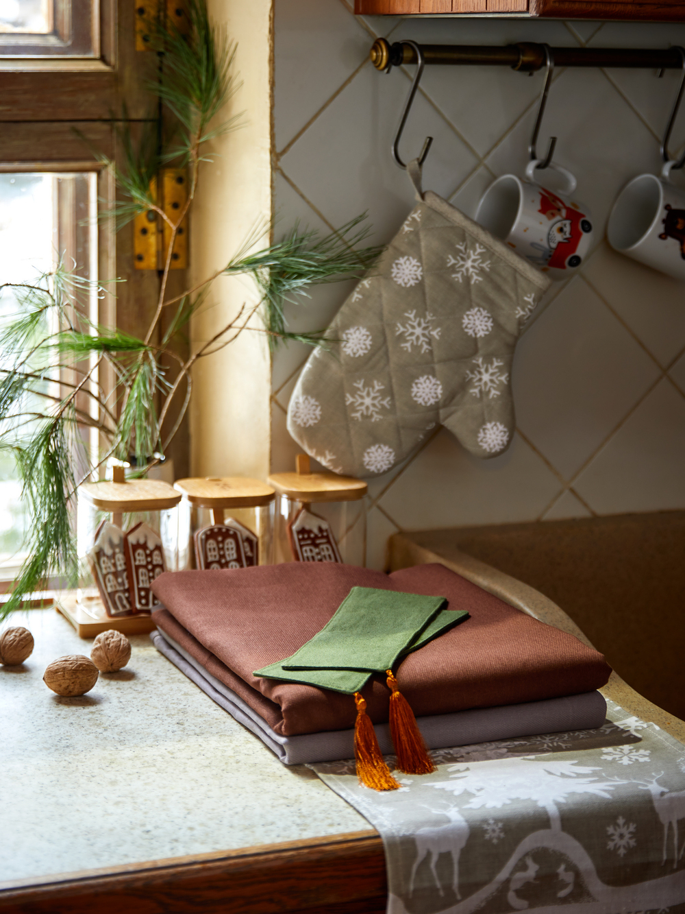 Набор кухонного текстиля Семейные ценности, скатерть Naturel, скатерть Naturel, набор контейнеров для специй Elan Gallery, кружка Сотвори чудо, сервиз Сотвори чудо