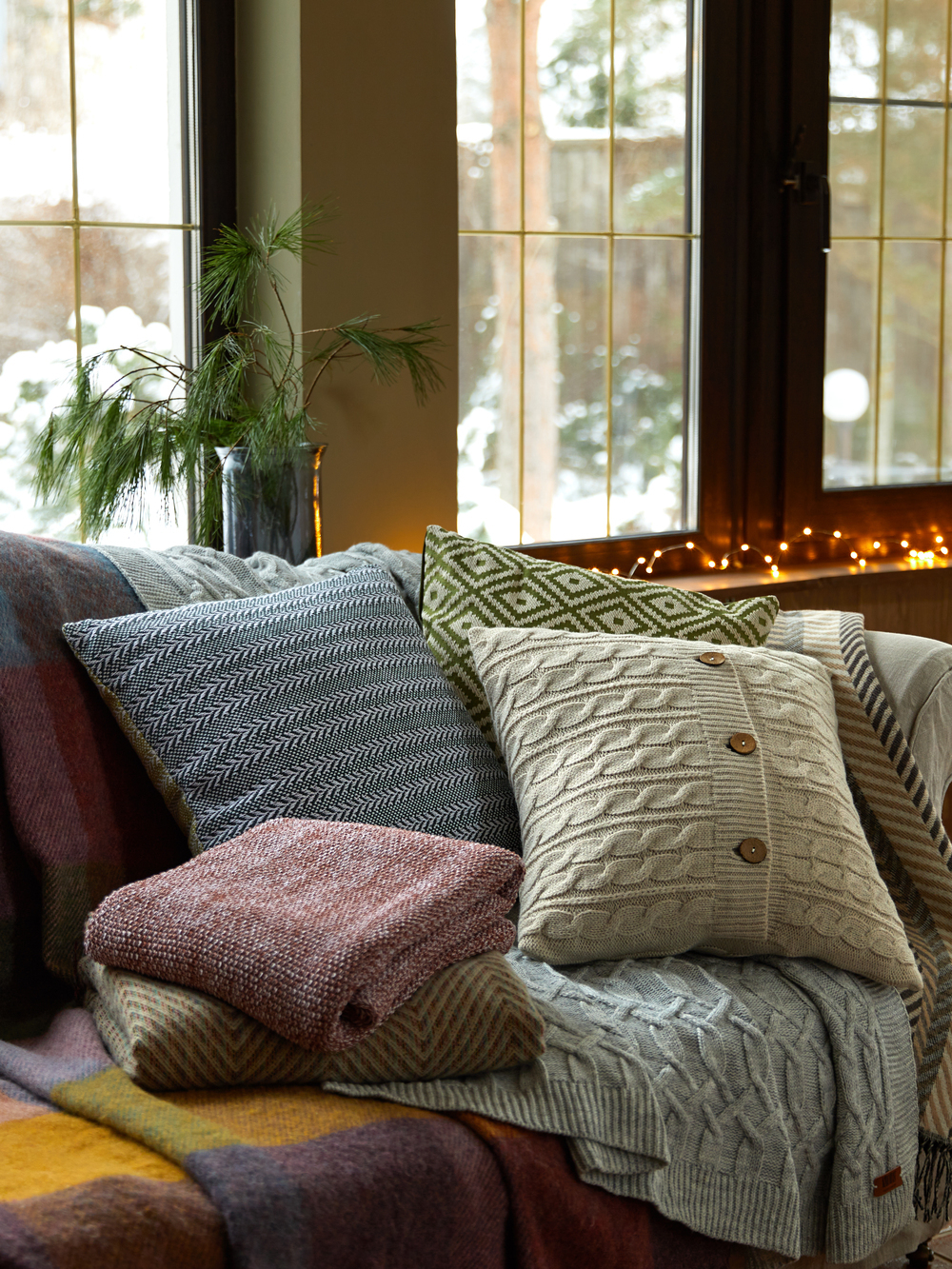 Мягкий текстиль — это всегда +100 баллов к домашнему уюту. Накидайте на диван подушек, добавьте пару шерстяных пледов — и не заметите, как уже устроились в этом теплом облаке с чашкой какао.