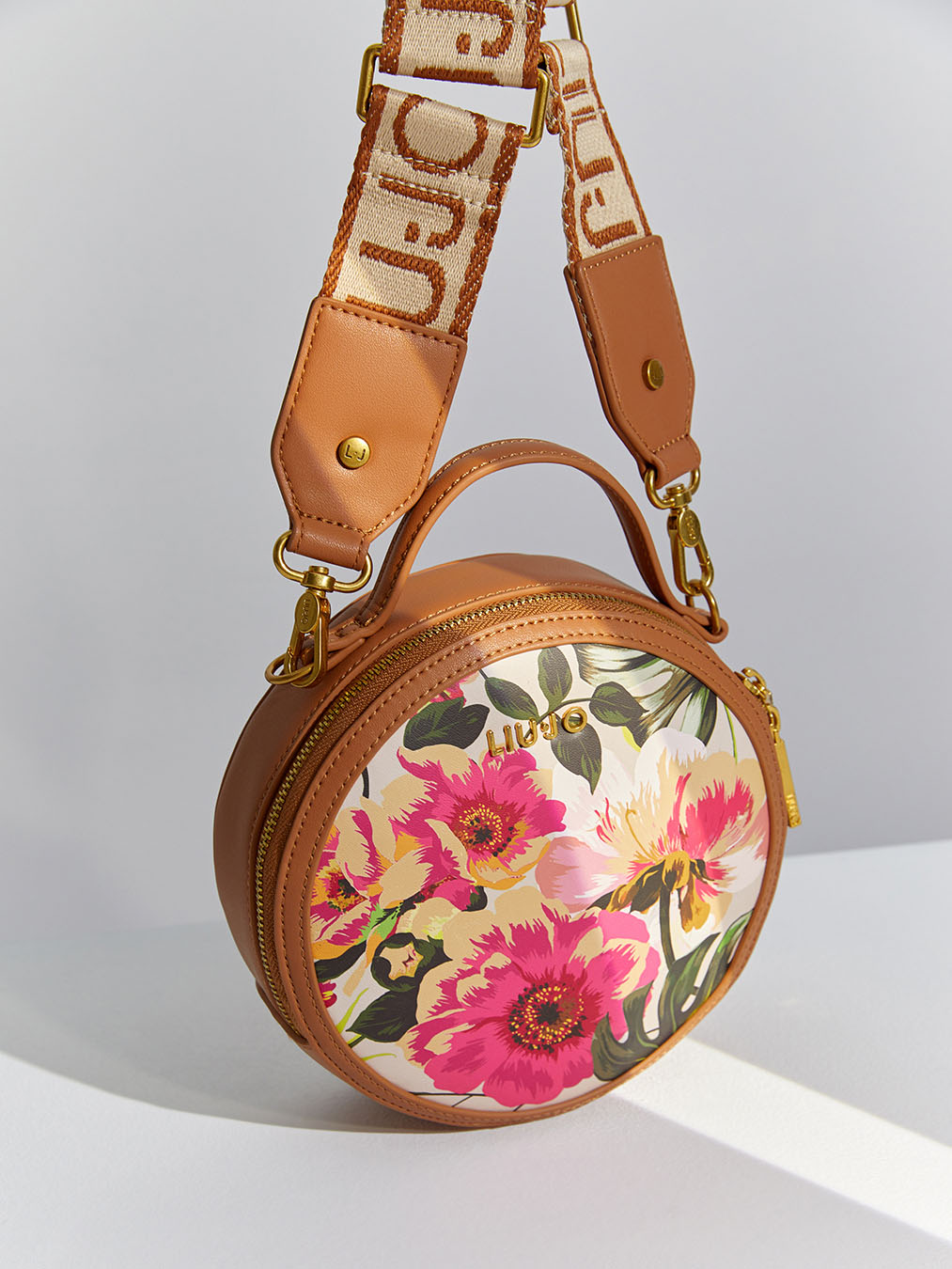 Круглая сумка с принтом, который обрамляют вставки из искусственной коричневой кожи, напоминает художественное полотно в деревянной раме: хочется брать в руки и рассматривать детали рисунка. Дополняйте ей монохромные образы в ярких или приглушенных цветах, но не перегружайте другими принтами — пусть аксессуар будет главным произведением искусства в комплекте.