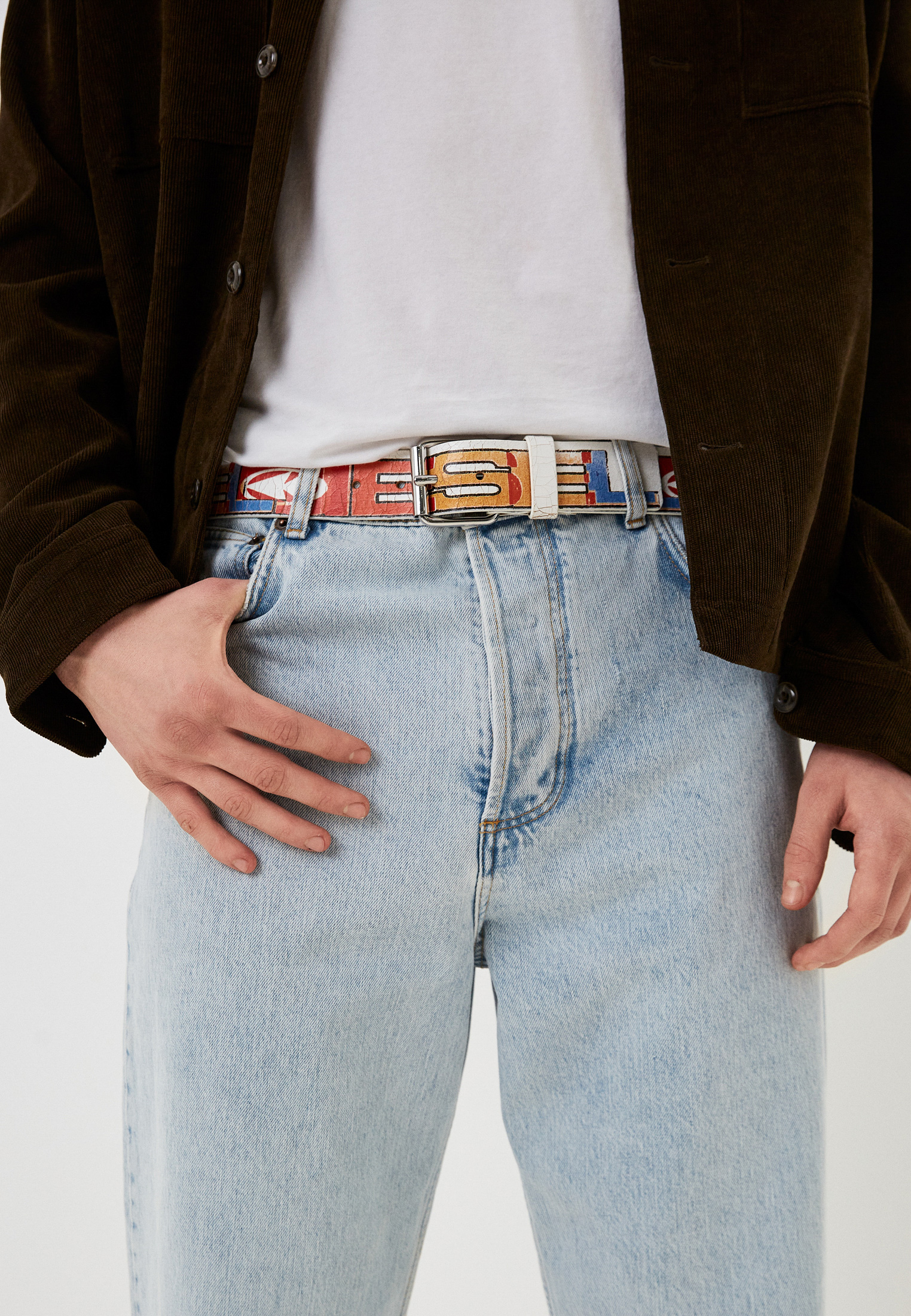 В последнее время популярность набирают вещи в винтажном стиле — они новые, но выглядят так, как будто у них уже есть история, длинною в жизнь. Потертости, необработанные края, дырки и другие детали старины добавляют особого шика и аутентичности. Этот ремень Diesel с «потрескавшейся» кожей и ретрорисунком точно подходит под описание тренда.