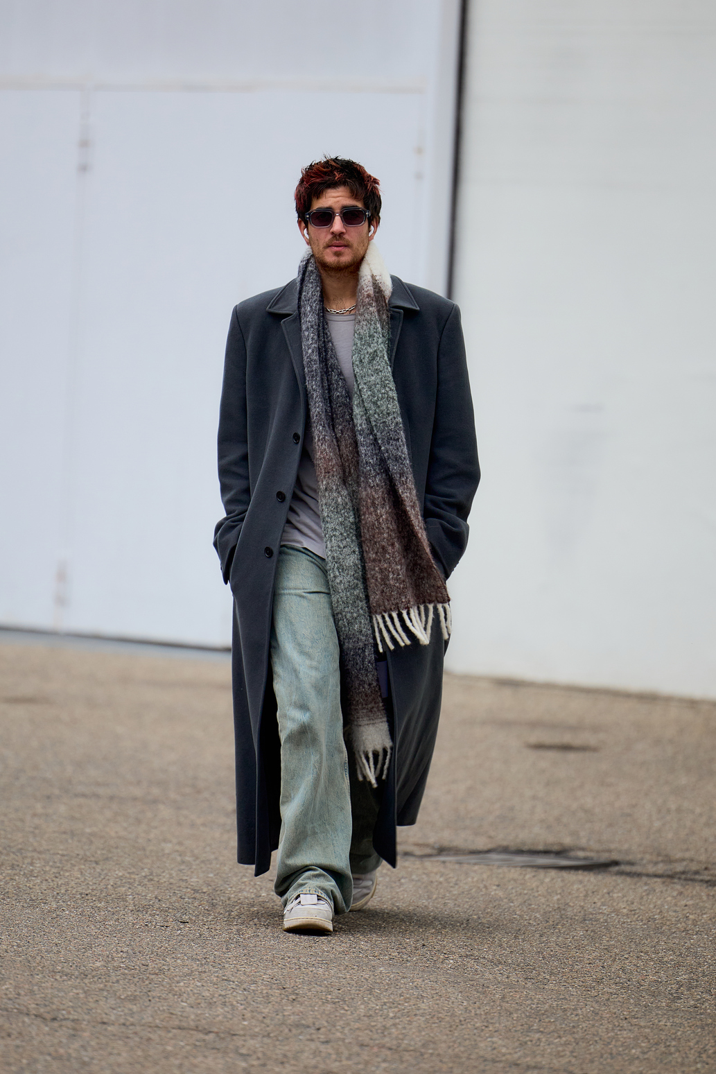 В приоритете — комфорт, поэтому выбирайте оптимальное комбо: свитшот + джинсы. Чтобы оно не выглядело слишком просто, обыграйте повседневный силуэт свободным пальто макси и длинным шарфом. В него всегда можно замотаться до носа, если не хочется столкнуться с кем-то из соседей.